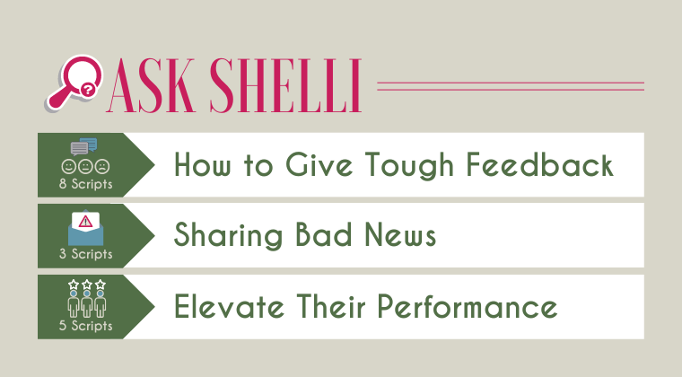 For most people, hearing feedback is uncomfortable and so is giving it. The Ask Shelli scripts will walk you through common situations with the right words and phrases to navigate giving tough feedback.